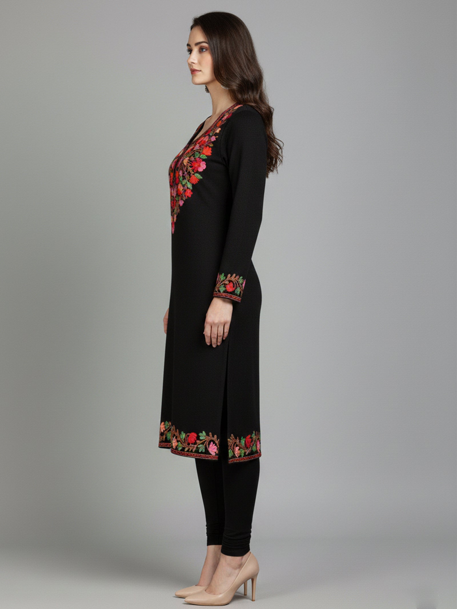 Clapton Black Wolen Winter wear Embroidered Kashmiri Aari Work Kurta (PHERAN)