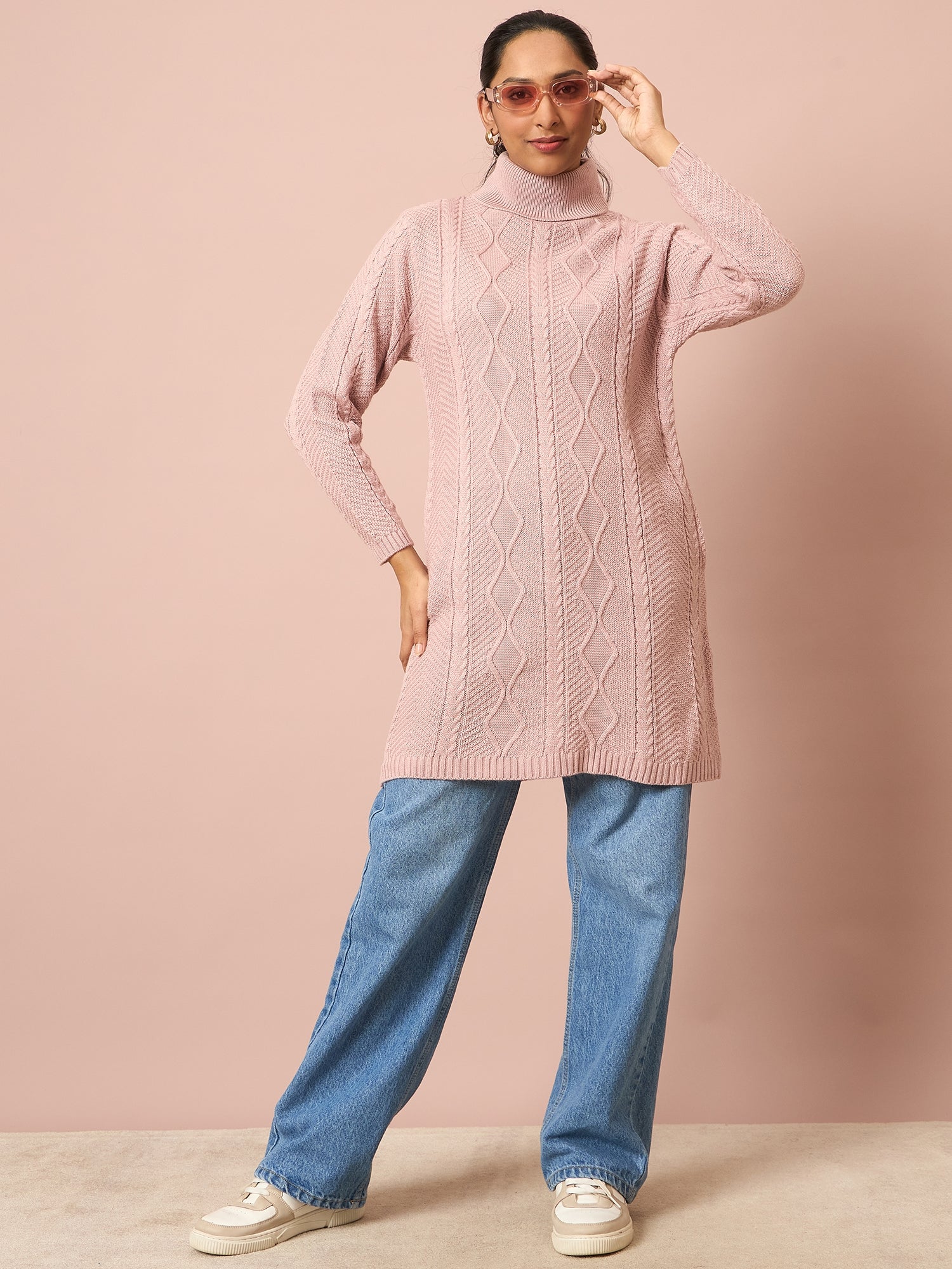 Stay winter and stylish with this above knee length jumper dress featuring a straight hem. The dress boasts long, regular sleeves and a sophisticated turtleneck. Crafted with a self design, it offers a unique texture and appeal. Made from soft, knitted fabric, it ensures both comfort and elegance. Perfect for pairing with boots or leggings for a versatile winter look