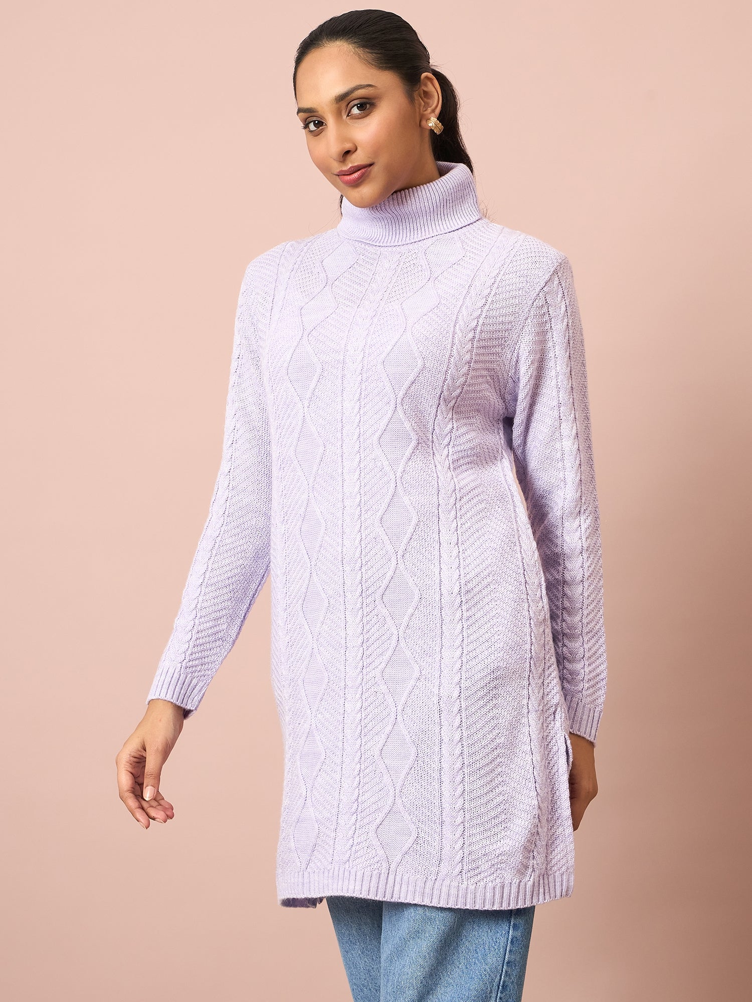 Stay winter and stylish with this above knee length jumper dress featuring a straight hem. The dress boasts long, regular sleeves and a sophisticated turtleneck. Crafted with a self design, it offers a unique texture and appeal. Made from soft, knitted fabric, it ensures both comfort and elegance. Perfect for pairing with boots or leggings for a versatile winter look