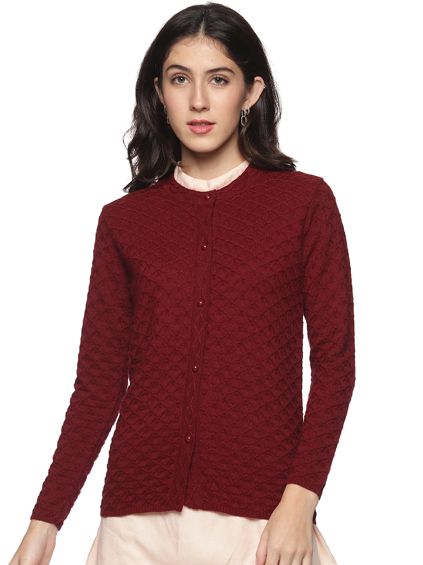Wool Blend Round Neck Maroon Cardigans