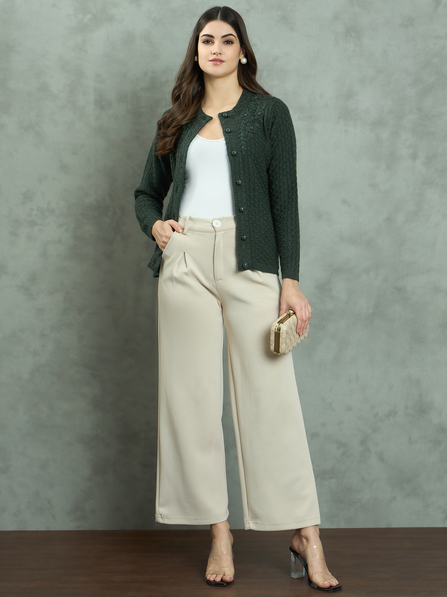 cardigan ,has a round -neck, long sleeves, button closure Embrace the elegance of simplicity with this Self Design Cardigan. Crafted for comfort and style, it features a flattering Round-neckline and long sleeves, making it perfect for layering during the colder months. The button closure adds a classic touch, allowing you to wear it open or closed depending on your look. This cardigan is a versatile piece that effortlessly elevates your everyday ensemble
