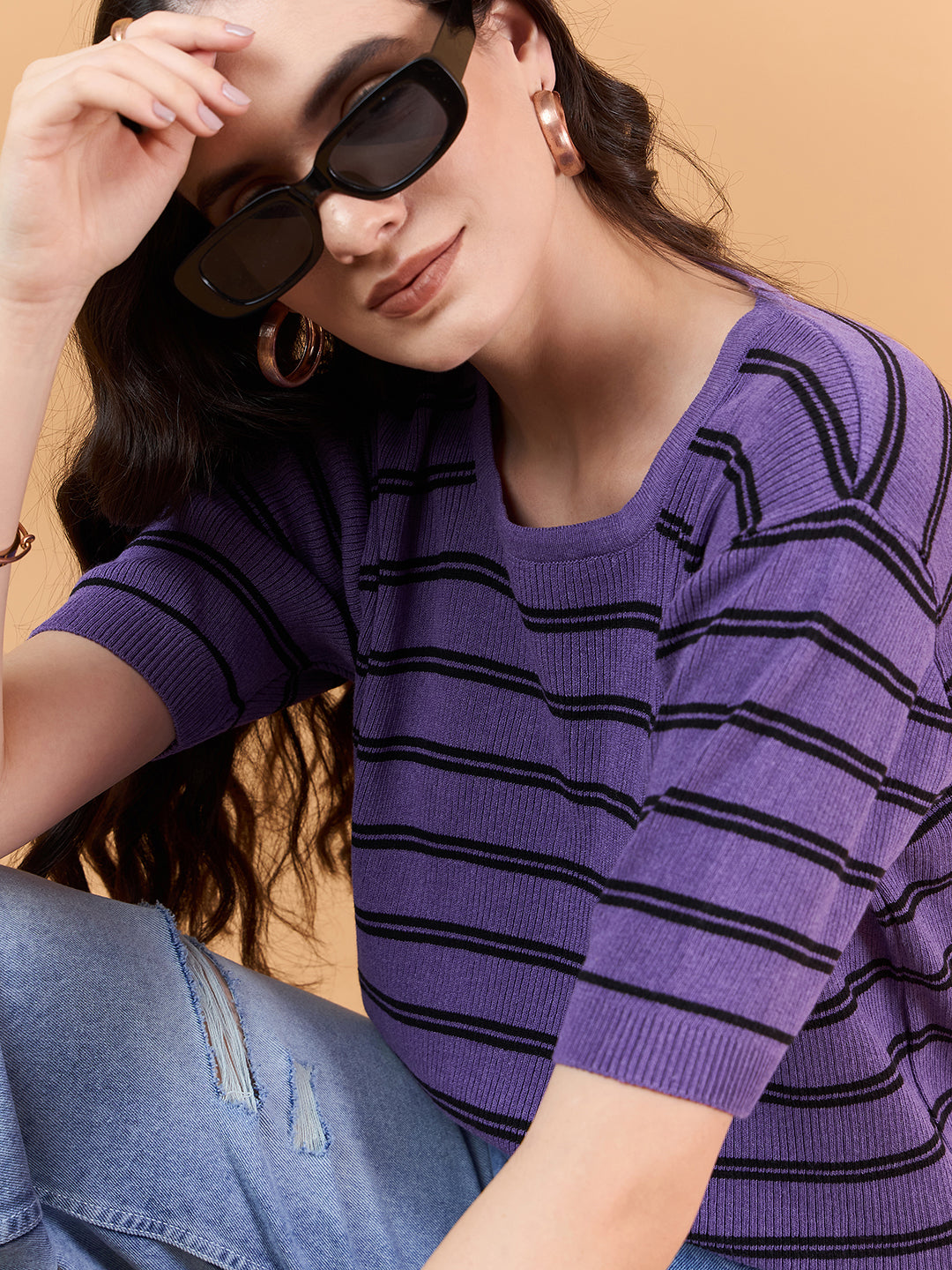 CLAPTON Women Knitted Round Neck T-shirt Combo Of 2 BLACK Purple