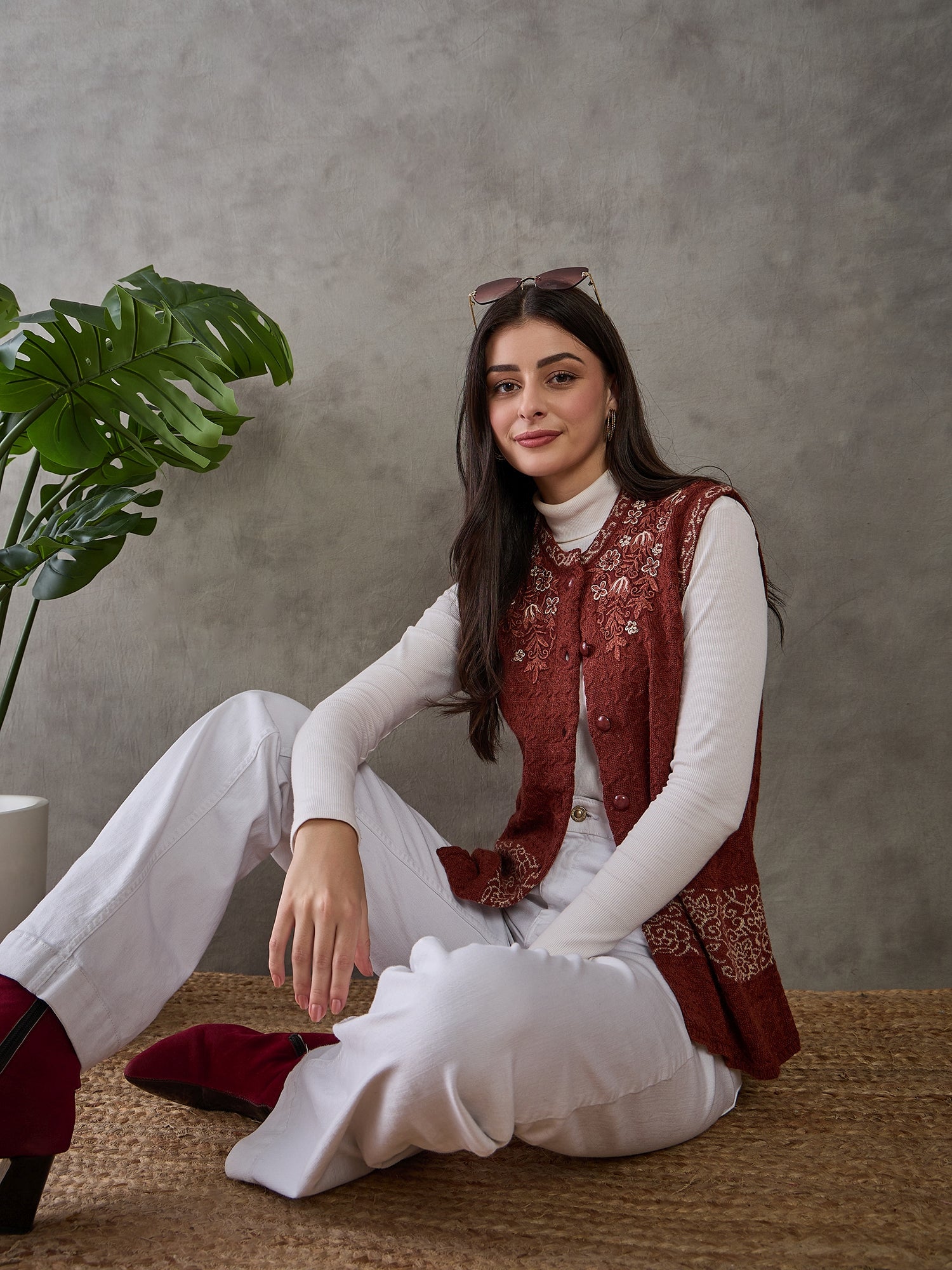 Clapton Women’s Woolen Sleeveless Sweater with Floral Embroidery Brown