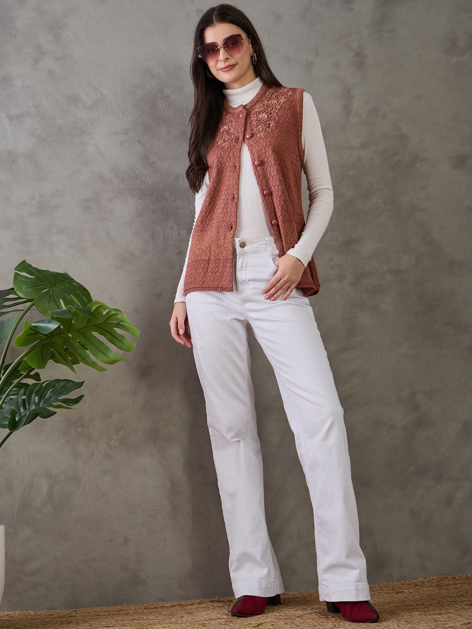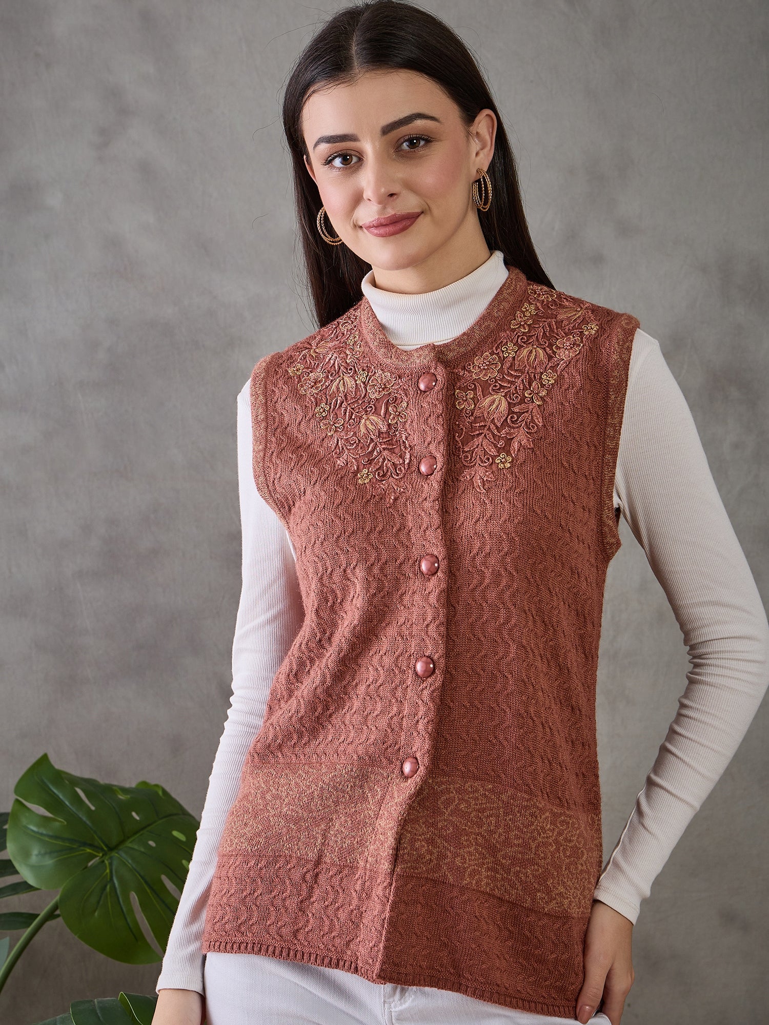 Clapton Women’s Woolen Sleeveless Sweater with Floral Embroidery Rust