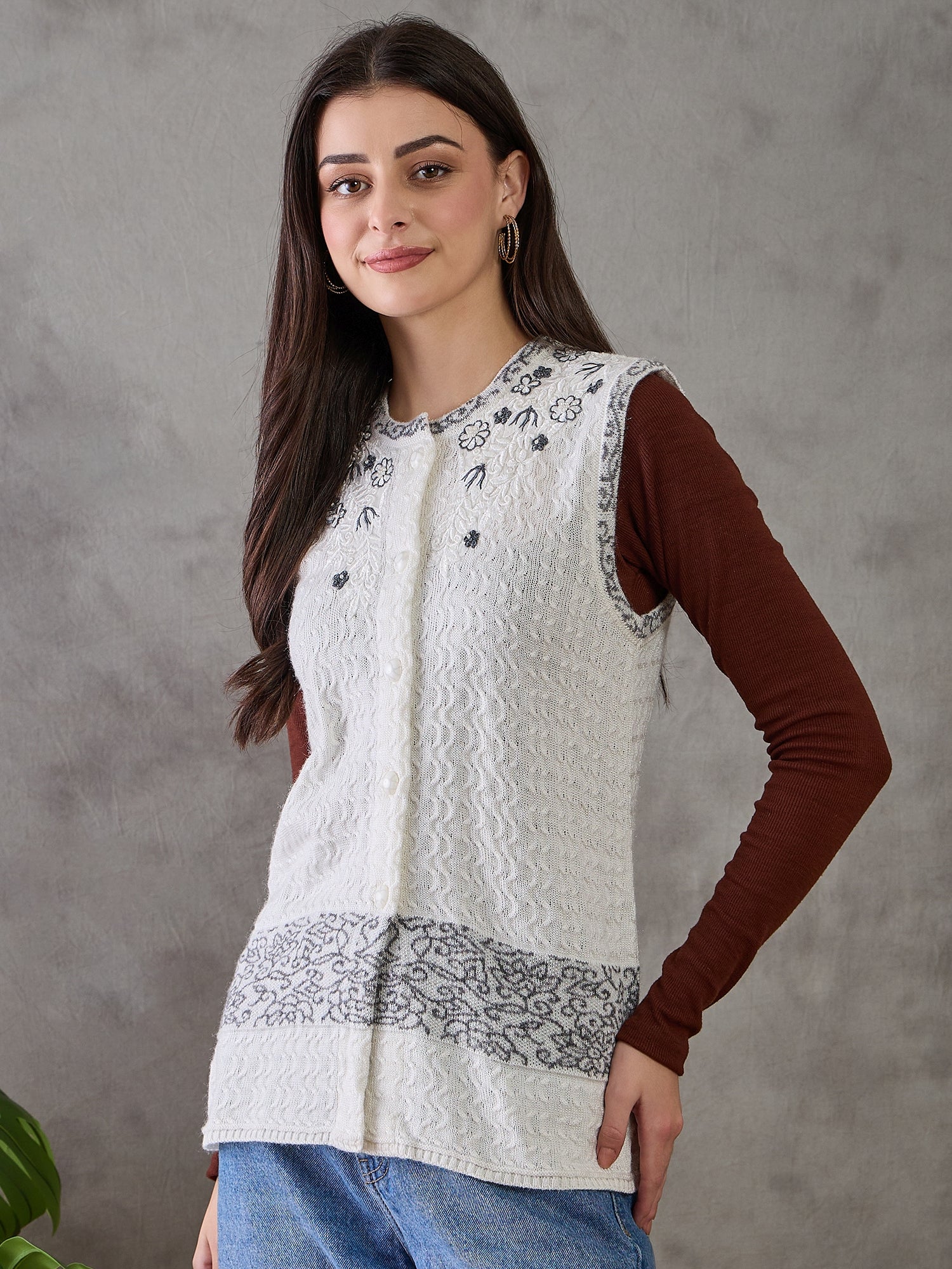 Clapton Women’s Woolen Sleeveless Sweater with Floral Embroidery White
