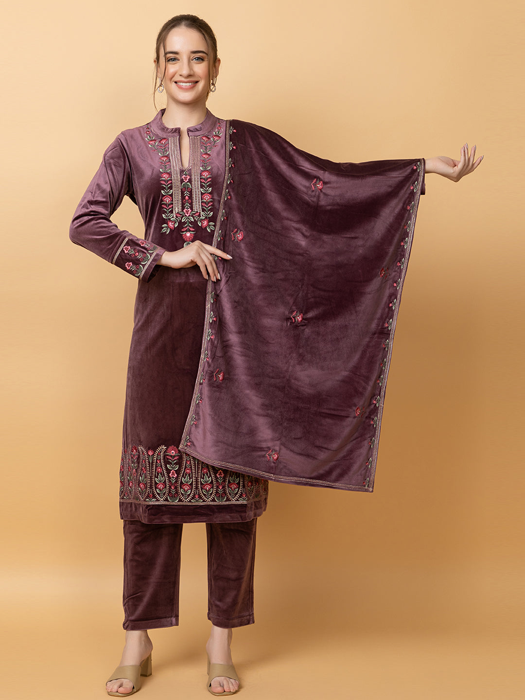 Velvet Embroidered Winter Wear Embroidered Straight Kurta Pant With Dupatta Set Purple
